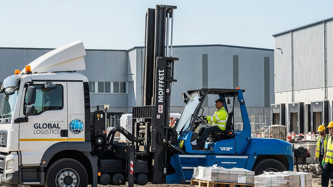 A mounted forklift delivery uses a truck equipped with a detachable forklift, often called a Moffett. This allows us to unload goods quickly and place them exactly where they’re needed on site — even in locations with limited access where standard forklifts or unloading methods may not work.